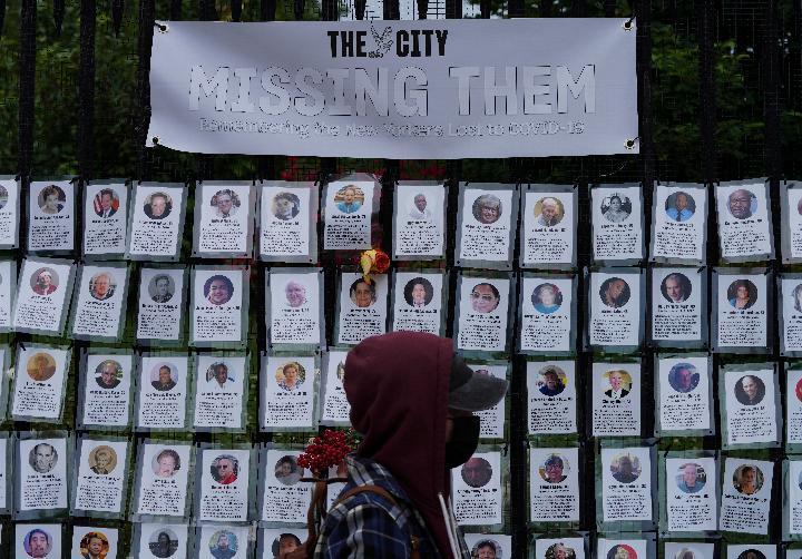 6月14日,行人從美國紐約一處墓地外為新冠死者設立的紀念裝置旁走過。(新華社記者王迎攝)