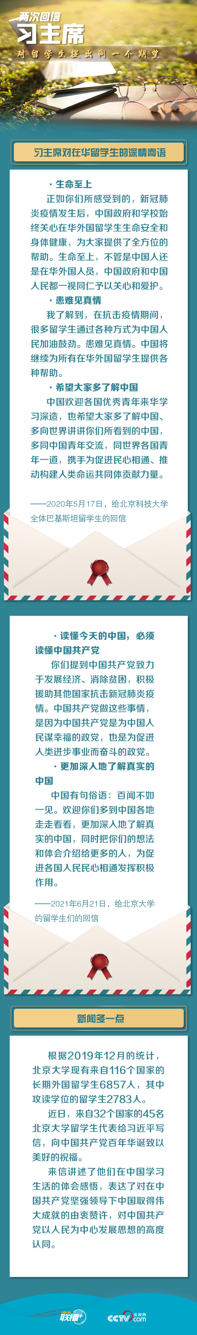 央視網《聯播+》特梳理兩次回信內容,帶您重溫習主席對在華留學生的深情寄語。