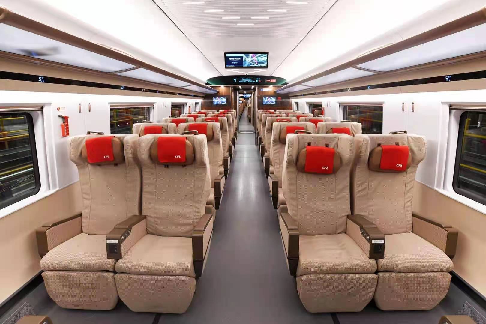 走進(jìn)車廂,雖然座椅布局沒有變化,但每個(gè)座椅都根據(jù)人體工程學(xué)進(jìn)行了優(yōu)化,乘坐更舒適。二等車廂的座椅除了保留以前座椅下方的充電設(shè)備,椅靠背上也增加了USB充電接口,小桌板杯托的凹槽加深,水杯放著更安全;一等座車廂,座椅增加了可調(diào)節(jié)頭靠、電動(dòng)腿靠等;商務(wù)座車廂座椅交錯(cuò)布置,還配備了支持手機(jī)投屏功能的智能交互終端,私密性、便捷性和舒適性都得到提升;無障礙車廂配備了更寬闊的通過門、無障礙衛(wèi)生間和輪椅放置區(qū)等。