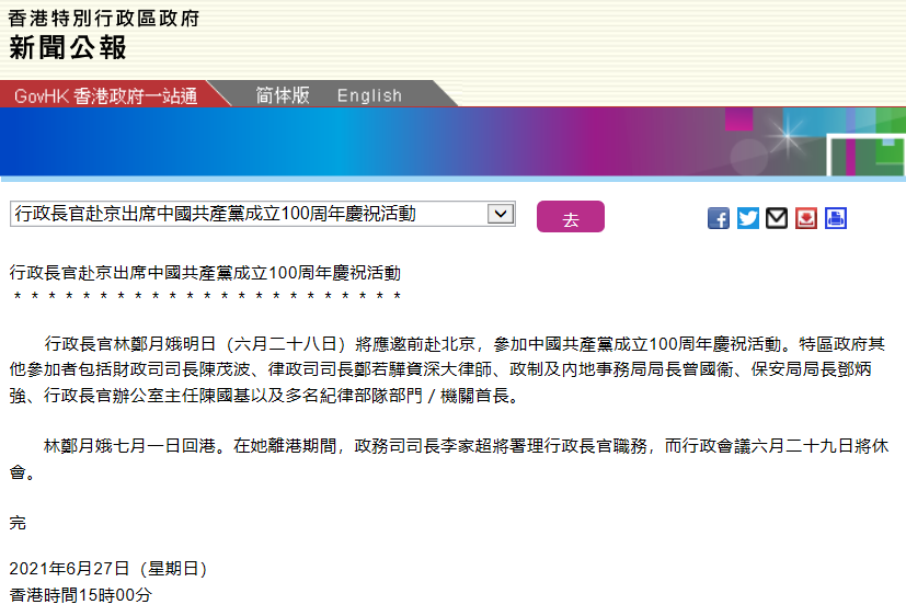 港府公報:林鄭月娥28日將赴京出席中國共產黨成立100周年慶祝活動
