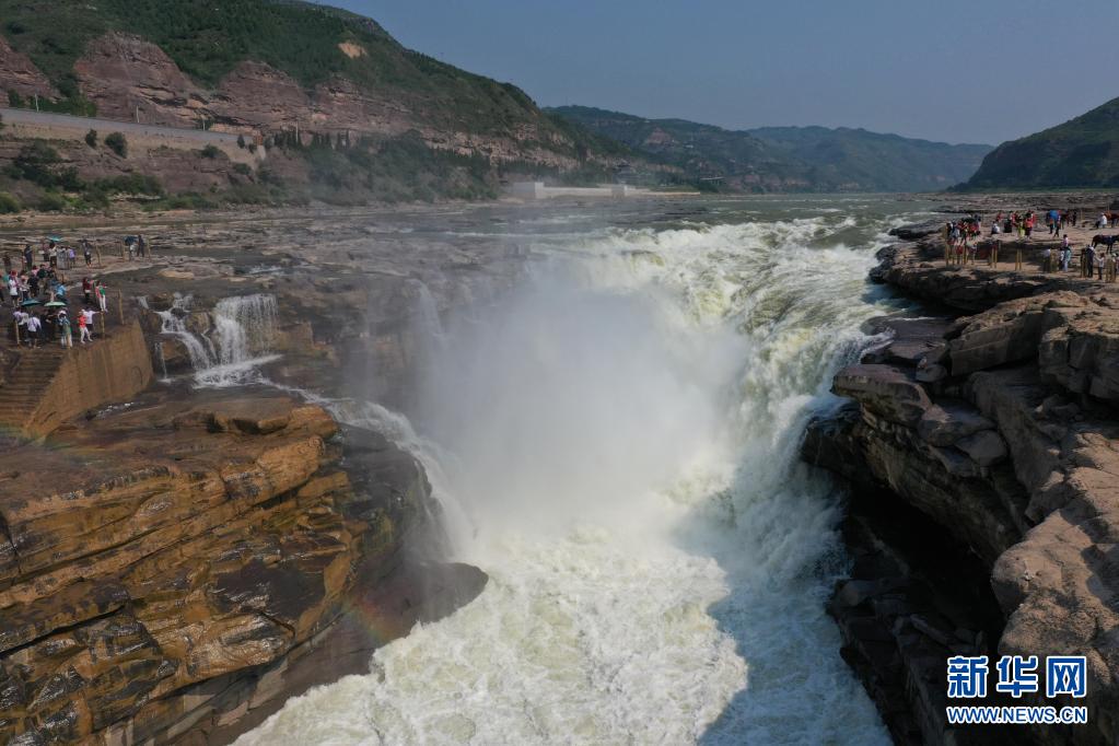 6月27日,游客在山西吉縣黃河壺口瀑布景區(qū)游覽(無人機照片)。