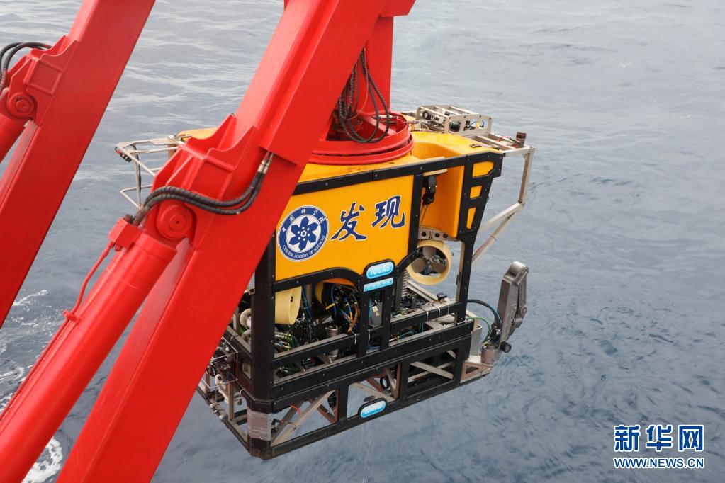 “科學(xué)”號(hào)科考船將無(wú)人纜控潛器放置在目標(biāo)海域(2021年6月攝)。