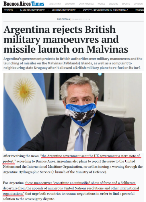 △《布宜諾斯艾利斯時報》報道截圖(題圖為阿根廷總統費爾南德斯戴著印有阿根廷國旗顏色和馬爾維納斯群島地圖的口罩)