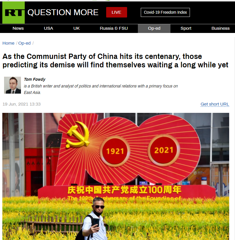 中國(guó)日?qǐng)?bào)網(wǎng)7月2日電 近日,英國(guó)國(guó)際關(guān)系專(zhuān)家湯姆·福迪在今日俄羅斯網(wǎng)站(RT)刊文稱(chēng),西方一些思想家對(duì)中國(guó)道路的否定源于其長(zhǎng)期意識(shí)形態(tài)偏見(jiàn),歷史證明,中國(guó)共產(chǎn)黨有足夠的能力克服每一次挑戰(zhàn)。