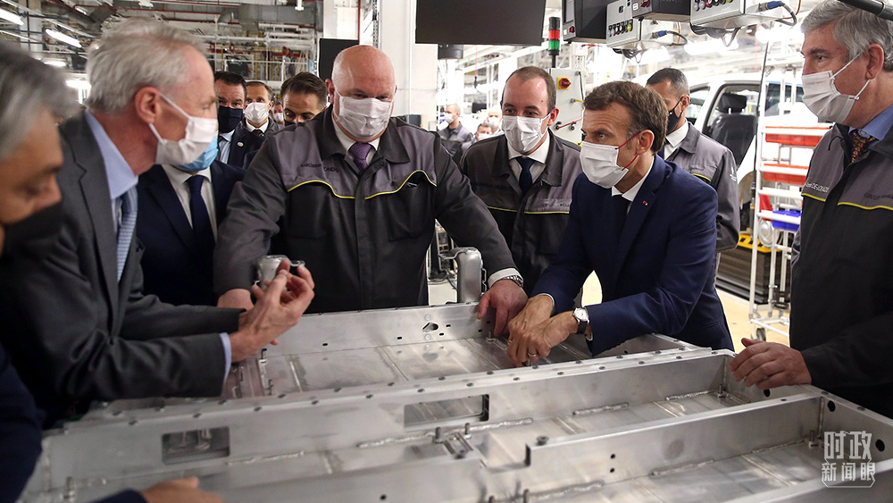 △2021年6月28日,馬克龍(右二)在參觀法國北部城市杜埃附近的工廠時,對中國企業將在這里投資建設電池工廠表示歡迎。(圖/視覺中國)