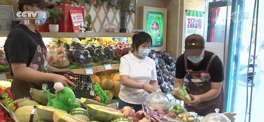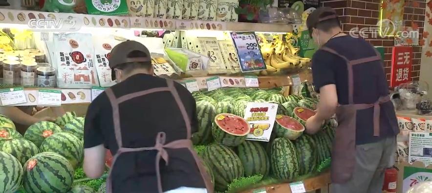 記者在北京一家水果連鎖門店看到,工作人員正在將剛剛采購的西瓜、葡萄、桃子等鮮果擺上貨架。負責人楊文鳳告訴記者,6月份至今,北方時令鮮果和南方熱帶水果均進入上市高峰期,水果供應數(shù)量充足、品種豐富。