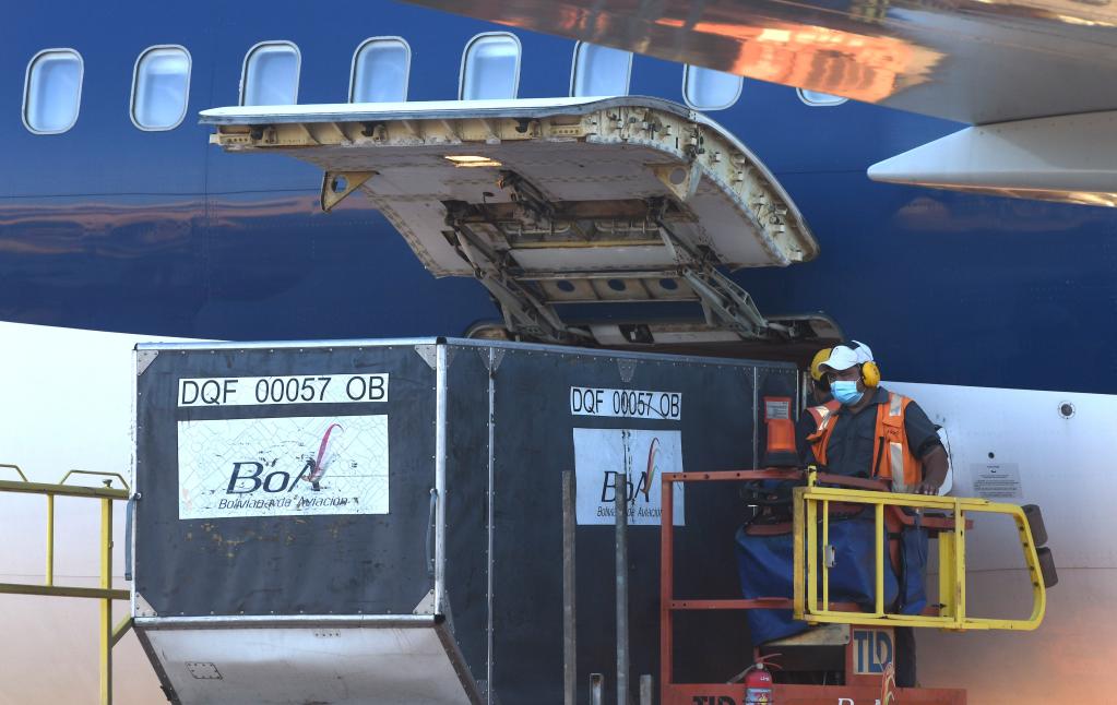 2月24日,工作人員在玻利維亞圣克魯斯的機場卸載中國新冠疫苗。新華社發(羅德里戈·烏拉加斯蒂攝)