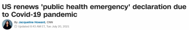 由于新冠病毒德爾塔變異株加速蔓延和疫苗接種推進受阻導(dǎo)致多地疫情反彈,美國衛(wèi)生與公眾服務(wù)部日前宣布自當?shù)貢r間20日起,將去年1月以來美國一直在實施的“公共衛(wèi)生緊急狀態(tài)”再次延長90天。