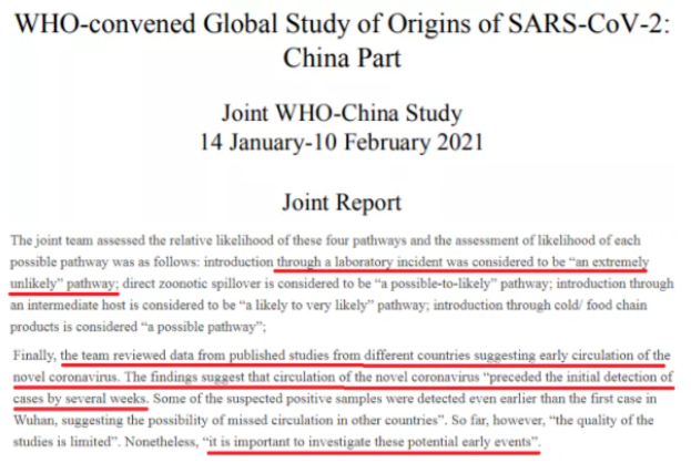 △根據(jù)世衛(wèi)組織溯源報告得出的結(jié)論,新冠病毒“極不可能”通過實驗室傳人;需要進一步調(diào)查世界其他地方出現(xiàn)的早期陽性樣本。