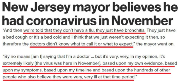 ——“根據(jù)我自己的證據(jù)、癥狀和病情發(fā)展,以及其他數(shù)百人也表示他們在那個時期病得非常非常厲害的事實,新冠病毒極有可能已經(jīng)在11月出現(xiàn)。”