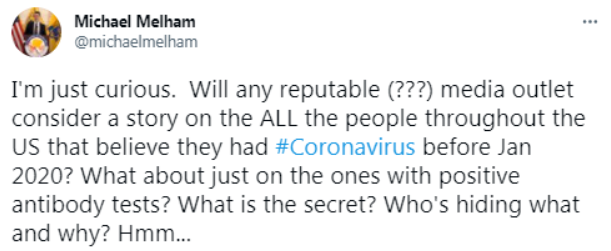 梅爾哈姆公開自己的遭遇后收到了很多有同樣經(jīng)歷者的郵件。他在社交媒體上呼吁負責任的媒體對這些被忽略甚至被隱瞞的早期可疑病例進行追蹤報道。“那些早就檢測出抗體的人在哪里?誰在隱瞞什么?為什么要隱瞞?”