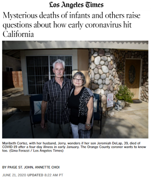 △《洛杉磯時報》報道截圖(題圖為瑪麗貝斯·科爾特斯和丈夫杰里,他們想知道39歲的兒子杰里米·德拉普是否在2020年1月初患病4天后死于新冠肺炎。)