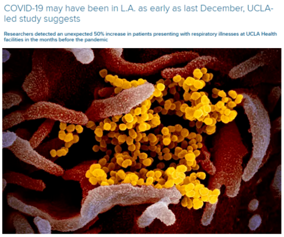 加州大學洛杉磯分校去年9月10日宣布,該校與華盛頓大學合作研究發(fā)現(xiàn),從2019年12月下旬開始并持續(xù)到2020年2月的呼吸道癥狀和疾病患者數(shù)量明顯增加,表明新冠病毒在具有臨床意識和檢測能力之前就已經(jīng)在美國的社區(qū)傳播。