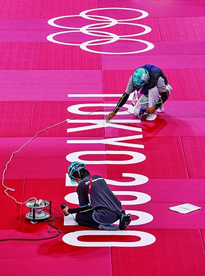 7月21日,日本武道館內(nèi)的奧運(yùn)會(huì)工作人員在柔道比賽臺(tái)墊上張貼奧運(yùn)標(biāo)識(shí)。新華社發(fā)