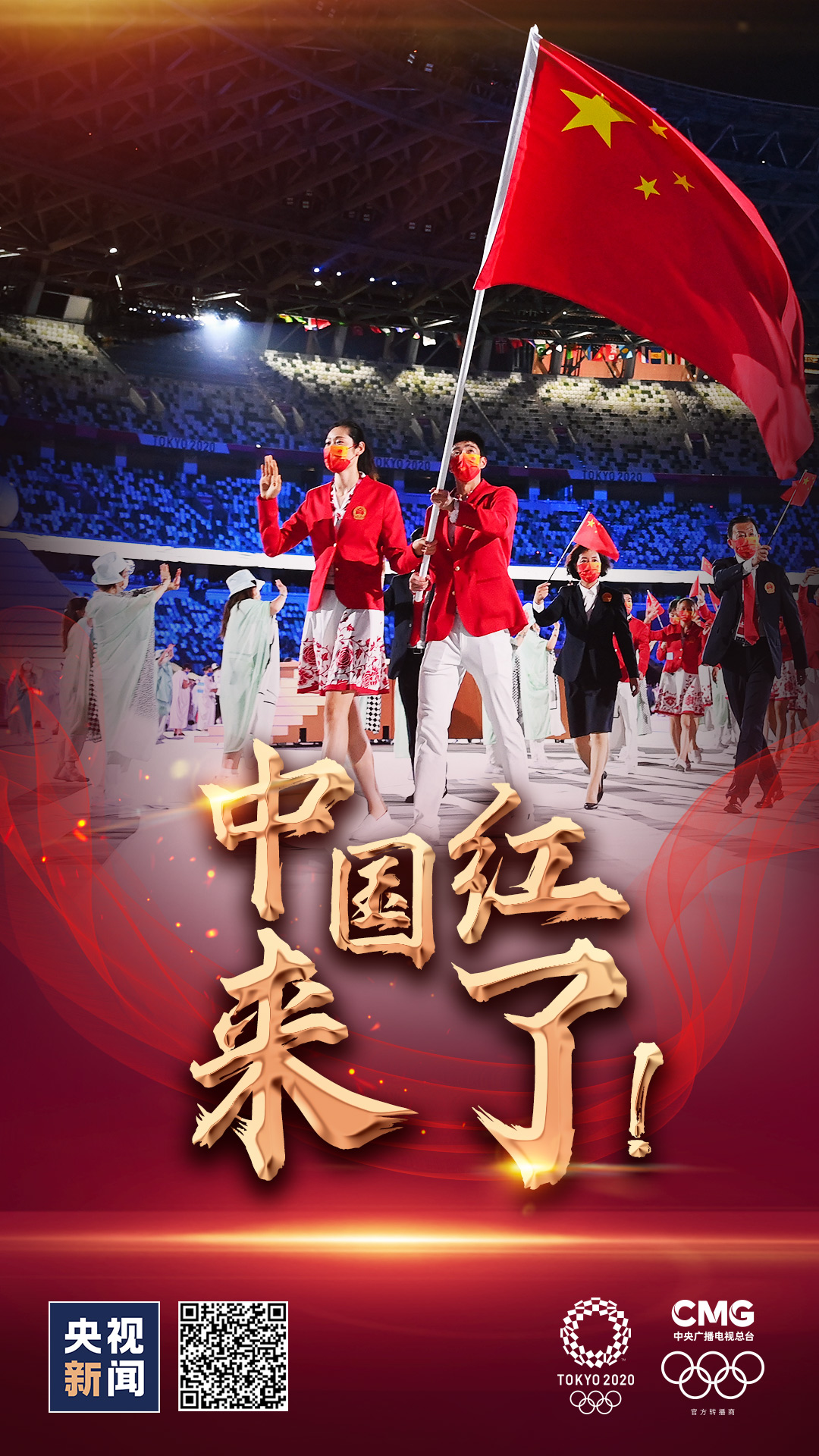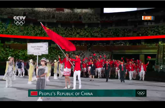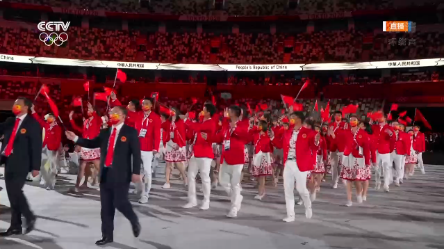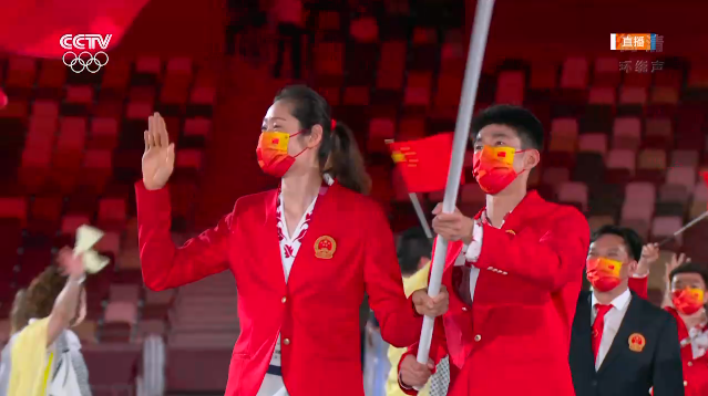 女排運動員朱婷、跆拳道運動員趙帥高擎五星紅旗,中國體育代表團步入東京奧林匹克體育場。