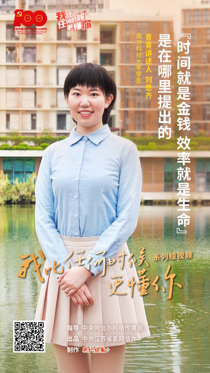 7月28日,“我比任何時候更懂你”系列短視頻第4集《“時間就是金錢,效率就是生命”是在哪里提出的?》上線,本集青青講述人是南方科技大學學生劉思齊。