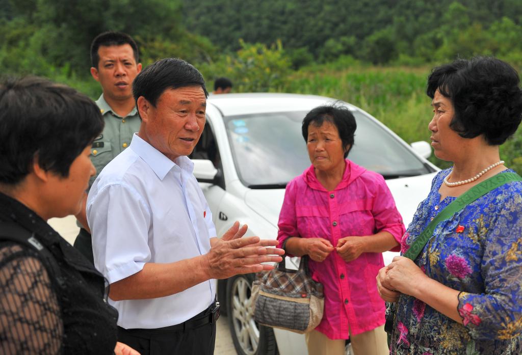 金春燮在與幾名烈士家屬交流(2015年8月12日攝)。新華社記者許暢攝