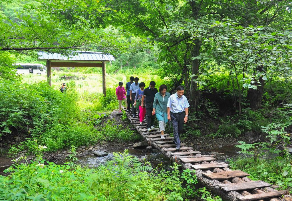 金春燮在踏訪(fǎng)一處抗聯(lián)密營(yíng)時(shí)途經(jīng)一處木橋(2015年8月12日攝)。新華社記者許暢攝