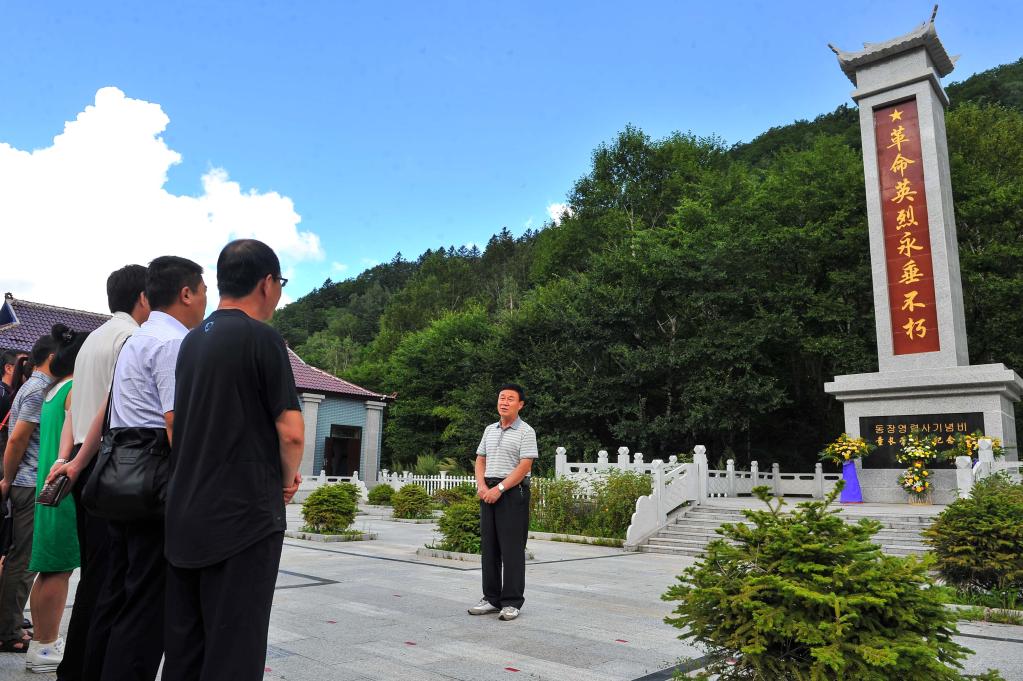 金春燮在童長(zhǎng)榮烈士墓地為參觀者講解抗戰(zhàn)事跡(2015年8月13日攝)。新華社記者許暢攝