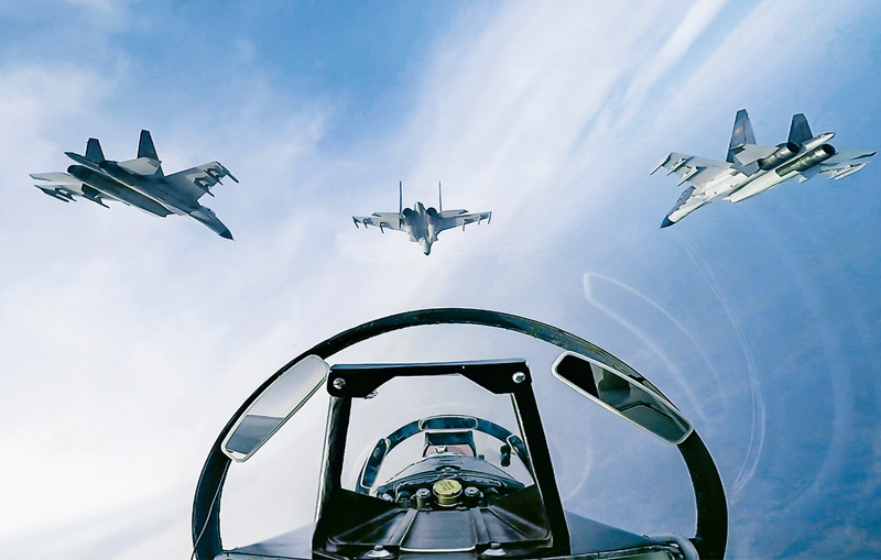 搏擊長空心向黨。圖為北部戰區空軍航空兵某旅飛行員在訓練中組成四機編隊,撲向地面目標展開進攻作戰。 新華社發 楊盼/攝
