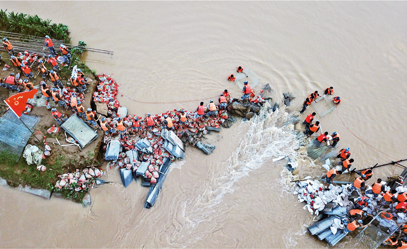 2021年7月,河南多地遭遇持續強降雨后,駐豫部隊爭分奪秒投入防汛搶險和災后重建,盡最大努力保障人民生命財產安全,盡快恢復百姓生產生活秩序。圖為空降兵某旅官兵用石塊、沙袋構筑子堤。 余紅春/攝