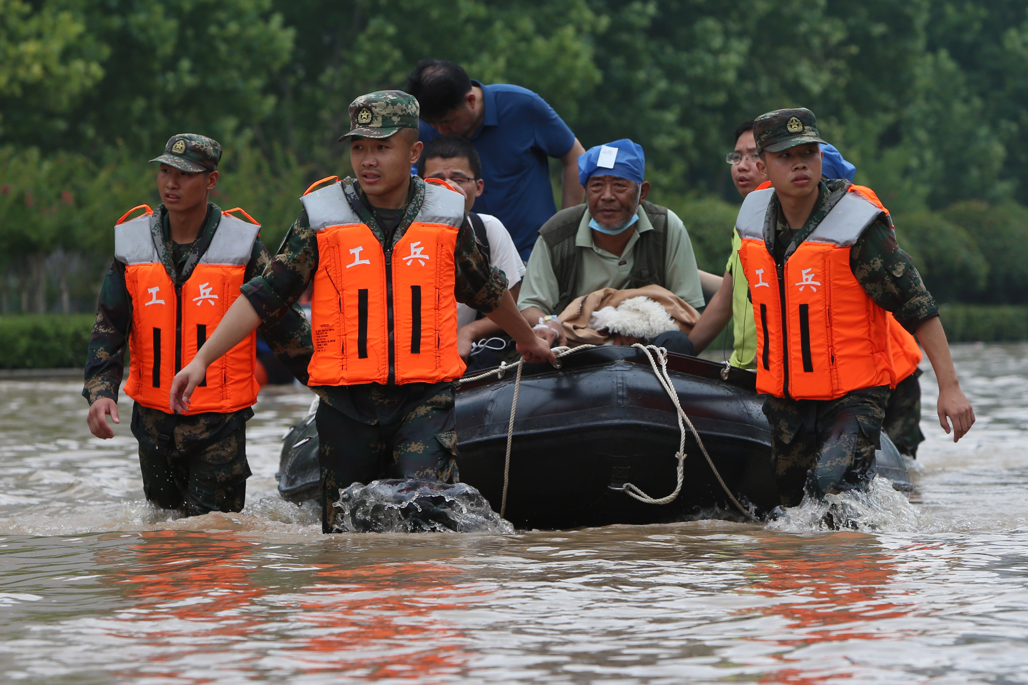 7月22日,在鄭州阜外華中心血管病醫(yī)院附近,救援人員轉(zhuǎn)移病患。
