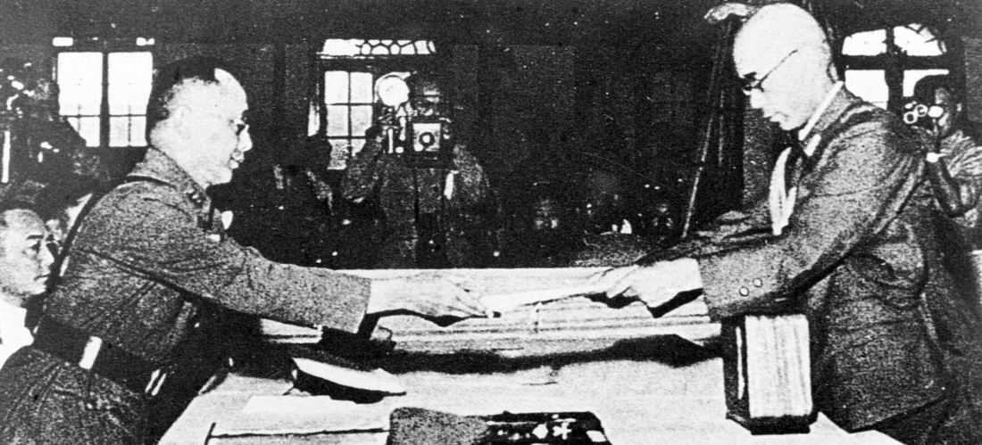 1945年9月9日,何應欽(左)在南京代表中國政府接受侵華日軍總參謀長小林淺三郎遞交的侵華日軍總司令岡村寧次簽署的投降書。新華社發