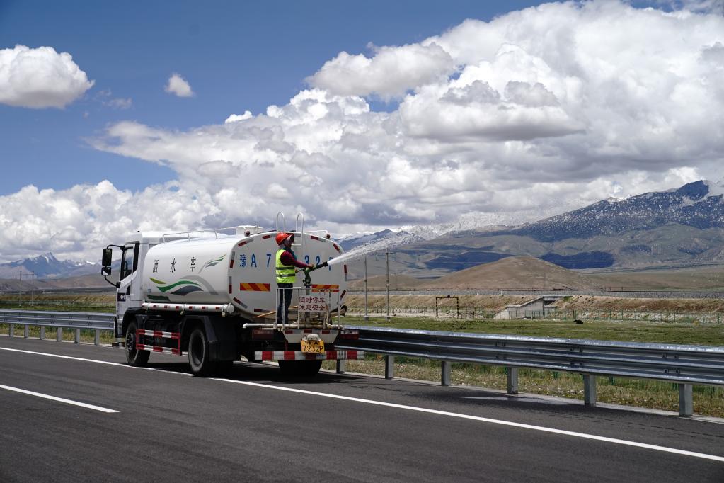 工人正在京藏高速那曲至羊八井段為路邊綠化植被灑水(2021年6月28日攝)。 新華社記者劉洪明 攝