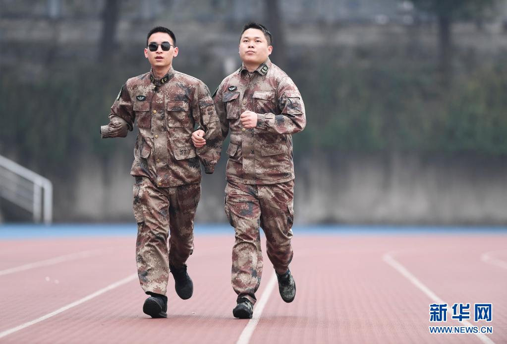 “排雷英雄戰士”杜富國(左)和戰友在陸軍軍醫大學操場上跑步(2020年1月2日攝)。新華社記者 王全超 攝