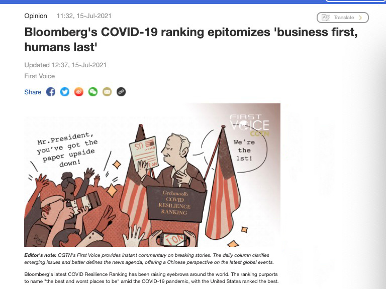 日前,美國彭博社更新了所謂“抗疫韌性排行榜”,美國位列第一、中國排在第八,排行榜還指出中國抗疫存在若干所謂“缺點”。CGTN就此作出回應,發布了《彭博社的全球抗疫排名體現了“商業第一,人民倒數第一”》一文,揭露彭博社“排行榜”的真相。