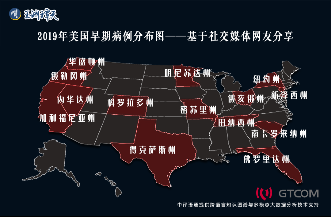 專業機構通過對上述數據進行人工篩查和專家研判,并結合對百余名實名認證用戶所描述的患病癥狀數據進行的機器學習處理,構建出美國早期病例的圖譜?梢钥闯,在美國,新冠病毒以及相應抗體出現的時間至少可以追溯到2019年10月。