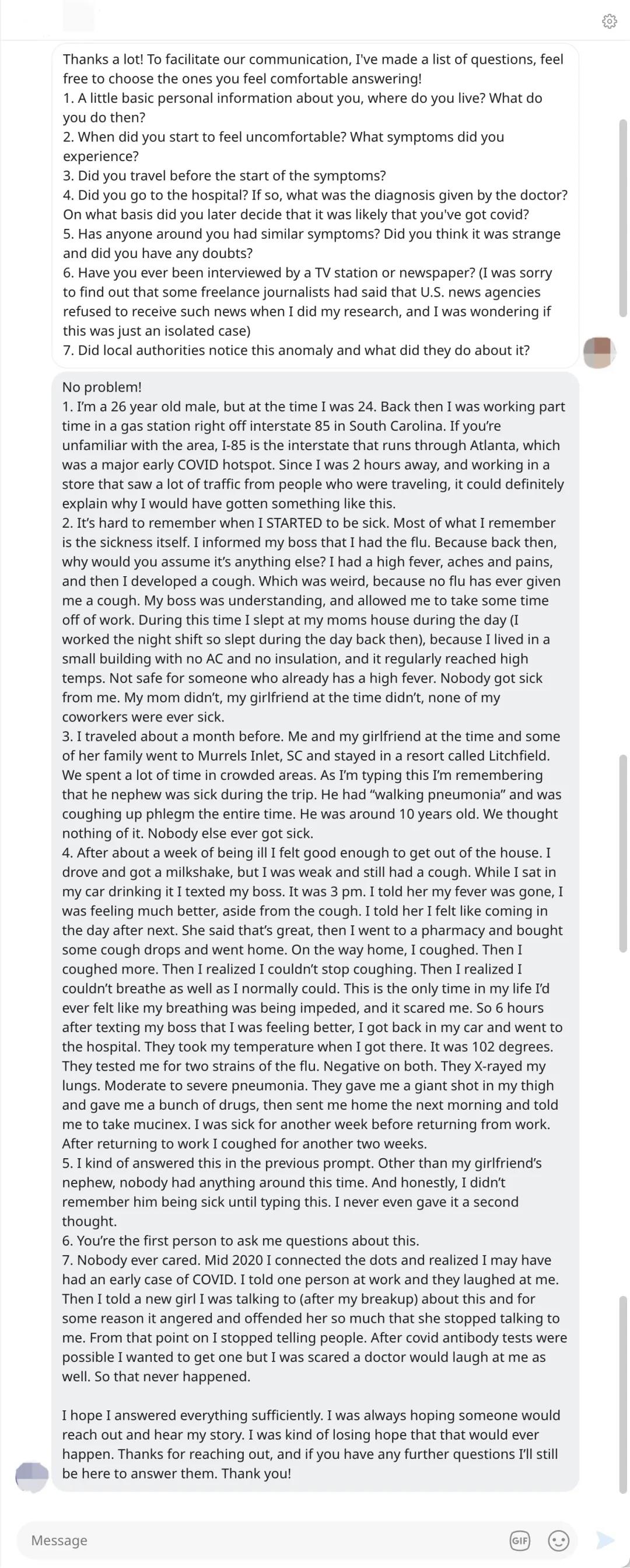所以,當譚主聯系到這位分享自己在2019年10月就疑似感染新冠的病例賽邦時,他坦言: