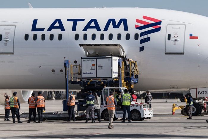 當(dāng)?shù)貢r(shí)間1月28日上午,首批近200萬劑由中國科興公司生產(chǎn)的新冠疫苗運(yùn)抵智利首都圣地亞哥。新華社發(fā)(豪爾赫·比列加斯攝)