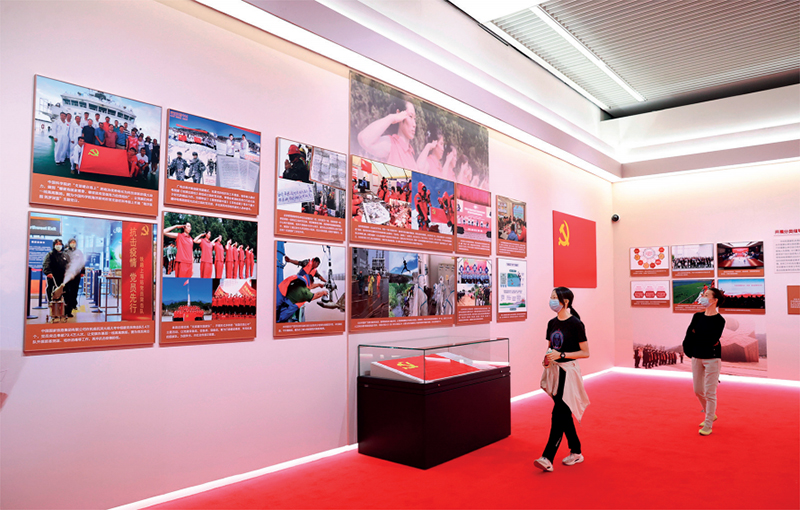 為慶祝中國共產黨成立100周年,2021年7月8日,“讓黨中央放心、讓人民群眾滿意——新時代中央和國家機關黨的建設成就巡禮展”在國家博物館開幕。展覽以貫徹落實習近平總書記在中央和國家機關黨的建設工作會議上的重要講話精神為主線,通過2700余幅圖片、185件實物、3000余冊圖書,生動展現了黨的十八大以來中央和國家機關黨建取得的顯著成績和深刻變化。圖為7月11日,觀眾在該展覽參觀。 中新社發 陳曉根/攝