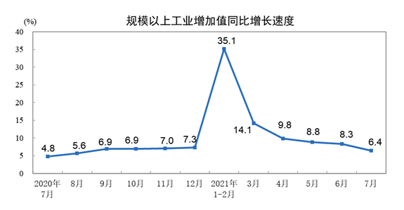 7月份,全國規(guī)模以上工業(yè)增加值同比增長6.4%,比6月份回落1.9個(gè)百分點(diǎn),高于2019年、2020年同期增速;兩年平均增長5.6%;環(huán)比增長0.30%。分三大門類看,采礦業(yè)增加值同比增長0.6%;制造業(yè)同比增長6.2%;電力、熱力、燃?xì)饧八a(chǎn)和供應(yīng)業(yè)同比增長13.2%。高技術(shù)制造業(yè)和裝備制造業(yè)增加值同比分別增長15.6%、6.4%,兩年平均分別增長12.7%、9.7%。分產(chǎn)品看,新能源汽車、工業(yè)機(jī)器人、集成電路、微型計(jì)算機(jī)設(shè)備產(chǎn)量同比分別增長162.7%、42.3%、41.3%、10.3%,兩年平均增速均超過14%。滿足基本消費(fèi)的產(chǎn)品增速較高。家用燃?xì)鉄崴鳌嬃稀⒒瘜W(xué)纖維產(chǎn)量同比分別增長13.9%、10.1%、9.3%。分經(jīng)濟(jì)類型看,國有控股企業(yè)增加值同比增長7.2%;股份制企業(yè)同比增長7.1%,外商及港澳臺商投資企業(yè)同比增長3.8%;私營企業(yè)同比增長6.1%。1-7月份,全國規(guī)模以上工業(yè)增加值同比增長14.4%,兩年平均增長6.7%。其中,醫(yī)藥制造業(yè)、電氣機(jī)械和器材制造業(yè)增加值同比分別增長29.3%、26.2%。7月份,中國制造業(yè)采購經(jīng)理指數(shù)為50.4%,連續(xù)17個(gè)月高于臨界點(diǎn);企業(yè)生產(chǎn)經(jīng)營活動預(yù)期指數(shù)為57.8%。