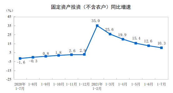 1-7月份,全國固定資產(chǎn)投資(不含農(nóng)戶)302533億元,同比增長10.3%,比1-6月份回落2.3個(gè)百分點(diǎn),兩年平均增長4.3%;7月份環(huán)比增長0.18%。分領(lǐng)域看,1-7月份基礎(chǔ)設(shè)施投資同比增長4.6%,兩年平均增長0.9%,比1-6月份回落1.5個(gè)百分點(diǎn);制造業(yè)投資同比增長17.3%,兩年平均增長3.1%,比1-6月份加快1.1個(gè)百分點(diǎn);房地產(chǎn)開發(fā)投資同比增長12.7%,兩年平均增長8.0%,比1-6月份回落0.2個(gè)百分點(diǎn)。全國商品房銷售面積101648萬平方米,同比增長21.5%;商品房銷售額106430億元,同比增長30.7%。分產(chǎn)業(yè)看,第一產(chǎn)業(yè)投資同比增長21.8%,第二產(chǎn)業(yè)投資同比增長14.4%,第三產(chǎn)業(yè)投資同比增長8.2%。民間投資同比增長13.4%。高技術(shù)產(chǎn)業(yè)投資同比增長20.7%,兩年平均增長14.2%;其中高技術(shù)制造業(yè)和高技術(shù)服務(wù)業(yè)投資同比分別增長27.1%、8.8%。高技術(shù)制造業(yè)中,航空、航天器及設(shè)備制造業(yè),計(jì)算機(jī)及辦公設(shè)備制造業(yè),醫(yī)療儀器設(shè)備及儀器儀表制造業(yè)投資同比分別增長49.7%、46.9%、34.9%;高技術(shù)服務(wù)業(yè)中,電子商務(wù)服務(wù)業(yè)、研發(fā)設(shè)計(jì)服務(wù)業(yè)投資同比分別增長42.7%、27.2%。社會領(lǐng)域投資同比增長13.1%,兩年平均增長10.9%;其中衛(wèi)生投資、教育投資同比分別增長31.8%、12.1%。