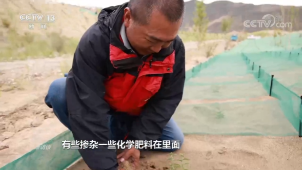 中國科學院西北生態環境資源研究院研究員常學向說:“在下面埋了一點保水劑,吸水比較好,當植物缺水的時候,它慢慢把水分再釋放給植物,摻雜了一些化學肥料在里面。”