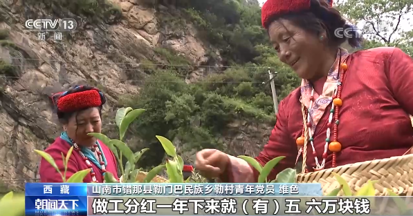 西藏山南市錯那縣勒門巴民族鄉勒村青年黨員 維色:現在的話我們光靠茶葉的話做工分紅一年下來就(有)五六萬塊錢,村子也變漂亮了,旅游的收入一年也有五六萬,這些都是黨和國家好政策給我們帶來的。去年我也入了黨,我們要像總書記說的那樣,努力做一個神圣國土的守護者,幸福家園的建設者。