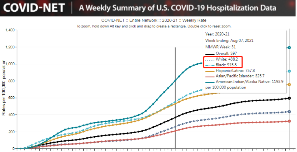 面對疫情,美國少數族裔更為脆弱和無助。美國疾控中心(CDC)當地時間19日發布的最新數據顯示,疫情期間,非洲裔美國人的新冠肺炎住院率為每10萬人915.8人,是白人(每10萬人438.2人)的兩倍以上。