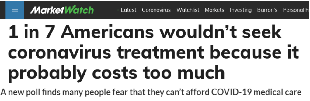 沒有保險就看不起病,成了疫情下底層民眾命運的真實寫照。蓋洛普民調發現,美國平均每7個人中就有1人因無力支付高額醫療費用,即使感染了新冠病毒也不敢就醫。