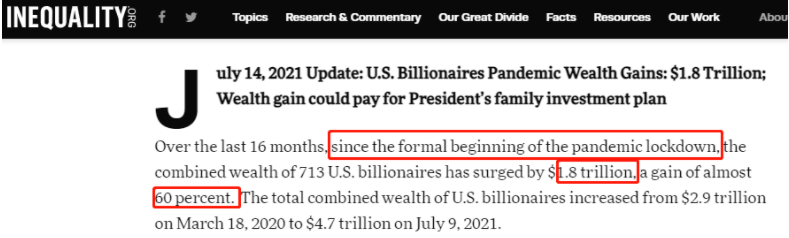 △非營利組織“INEQUALITY”網站:從去年3月到今年7月,美國713位億萬富豪的資產總和增加了1.8萬億美元,達4.7萬億,漲幅接近60%。