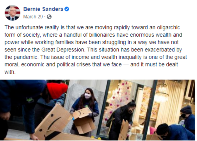 對此,美國無黨派聯邦參議員伯尼·桑德斯曾撰文稱,貧富不均是美國面臨的重大道德、經濟和政治危機。“我們正迅速走向寡頭政治,少數億萬富豪擁有巨大的財富和權力,而工薪家庭卻在以自大蕭條以來從未見過的方式掙扎。”