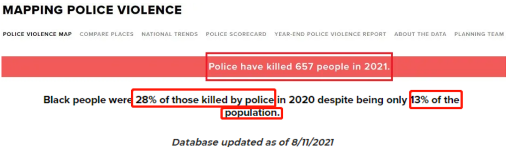 據美國“警察暴力地圖”(MPV)網站統計,2020年美國警察共開槍打死1127人,只占美國總人口13%的黑人占到了被警察槍殺人數的28%。今年截至目前的最新數據顯示,美國警察已經殺死657人,黑人占比仍遠高于其占美國總人口比例。