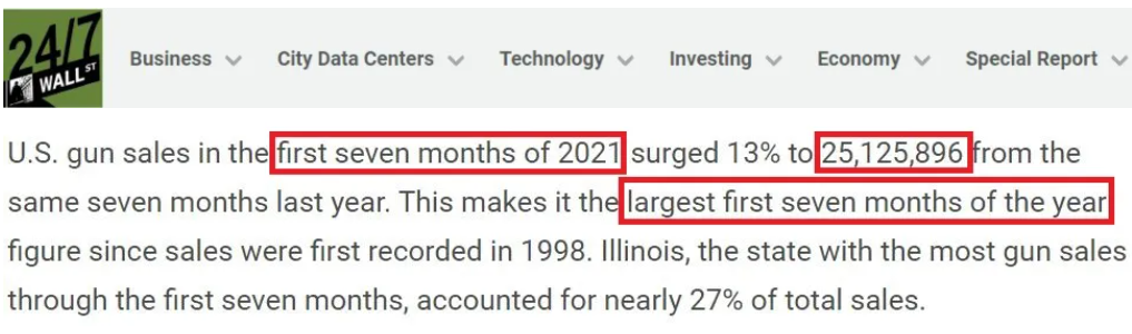 美媒發布的最新數據顯示,今年僅前7個月,美國槍支銷量就已超過2500萬支,創下1998年有記錄以來的同期最大銷量。