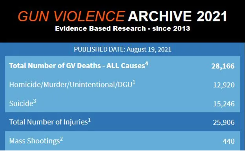 而“人人有槍”的結果就是槍禍的橫行。美國“槍支暴力檔案”(GVA)網站最新統計顯示,截至當地時間19日,今年全美(不包括自殺在內的)各類槍支暴力事件已導致12920人喪生;造成四人以上傷亡的大規模槍擊案已發生440起。