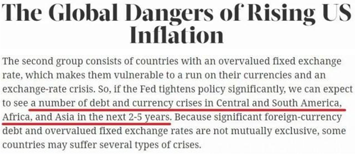 ——為了讓全世界為自己不負責任的經濟刺激消極后果買單,美聯儲憑借美元霸權不斷超發貨幣,向世界各國輸出通脹,成為“全球第一貨幣濫發國”,世界報業辛迪加的報道就此批評指出,美國的這番操作將給全世界帶來輸入性通脹危險。一旦美聯儲轉向大幅收緊貨幣政策,可以預計在未來2-5年內,拉美、非洲和亞洲將出現一系列債務和貨幣危機。