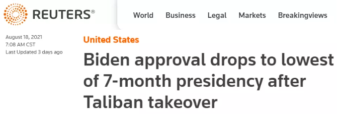 事實上,就連美國人也對自己的政府越來越不滿意了。根據路透社和益普索最新公布的每周民調結果,在美國從阿富汗倉促撤軍、阿富汗局勢發生重大變化后,拜登的支持率從上周的53%下滑7個百分點,降至他上任以來的最低水平。