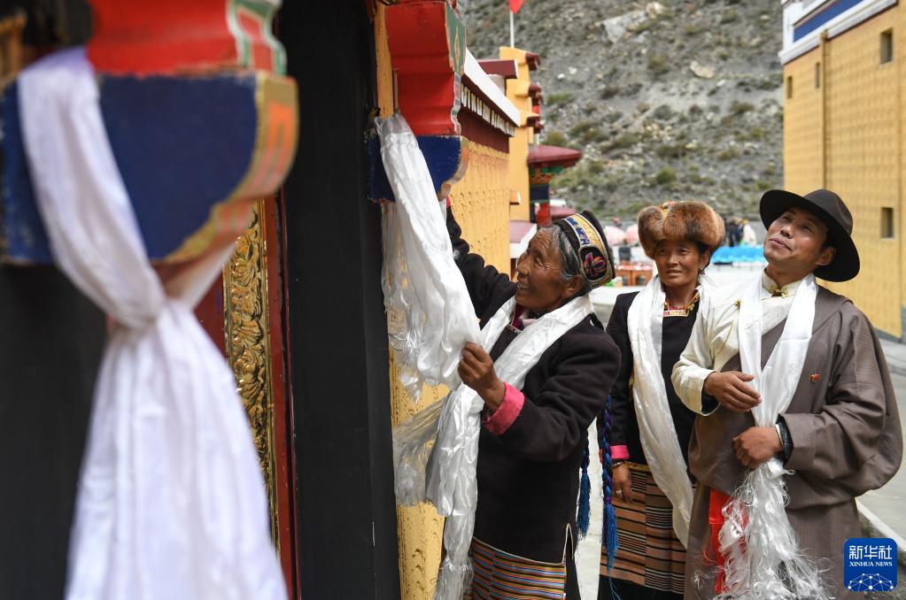 西藏山南市洛扎縣洛扎鎮居民旦增曲珍(左)給新房獻哈達(2019年9月21日攝)。新華社記者 晉美多吉 攝