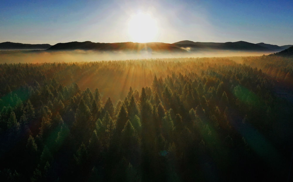 ↑塞罕壩國家森林公園晨景(2021年6月27日攝,無人機照片)。