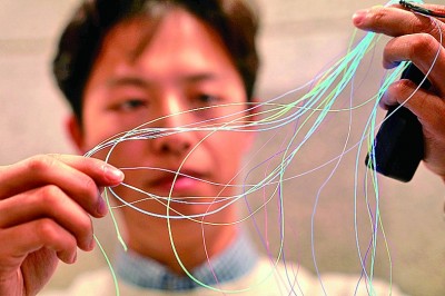 復旦大學科研人員展示用于編織的發光纖維。新華社發